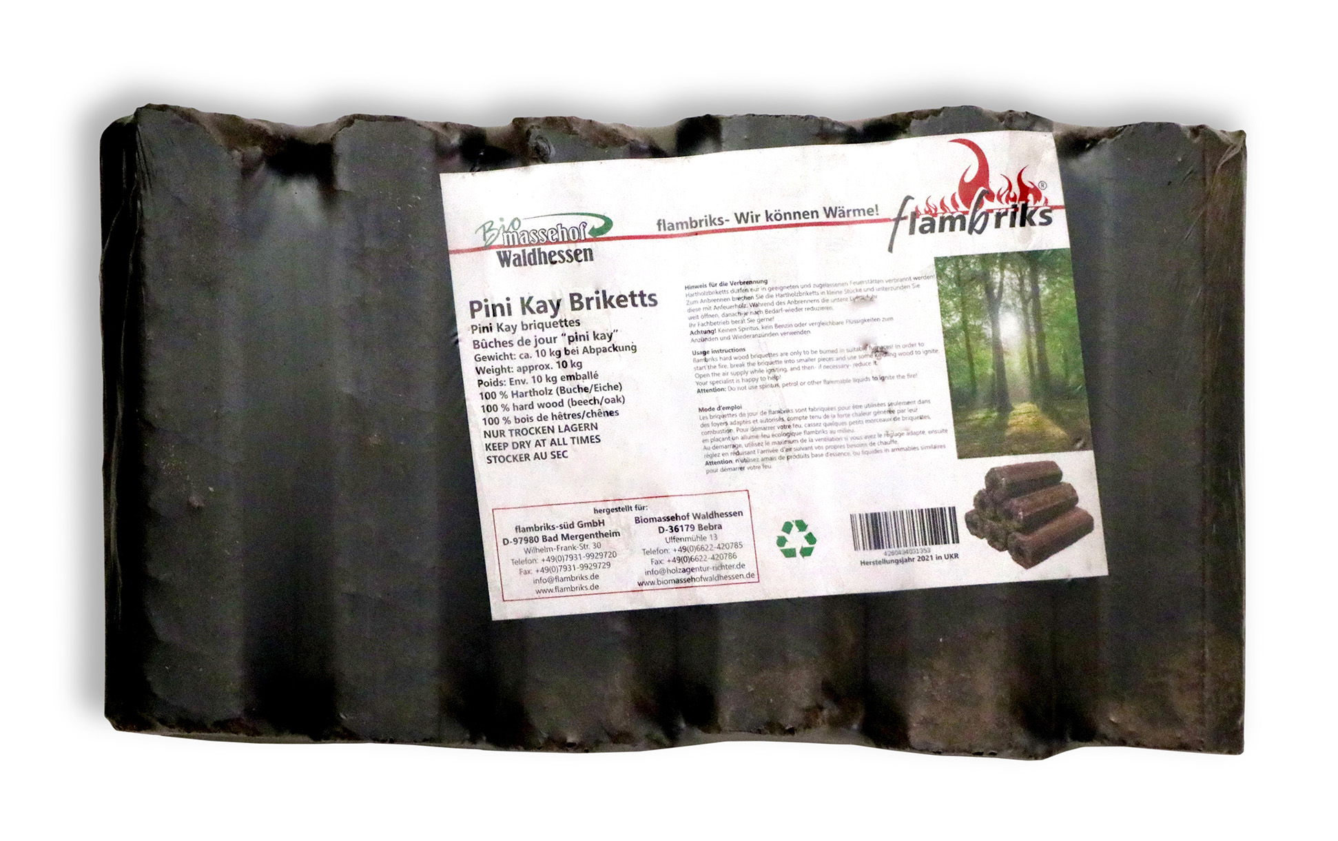 Unsere Pini Kay Briketts sind aus Eichen-/Buchenspänen sehr hart gepresst. Sie dehnen sich nicht so stark aus wie unsere runden Briketts.